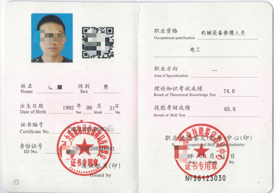 (職業(yè)資格證書內(nèi)頁(yè))